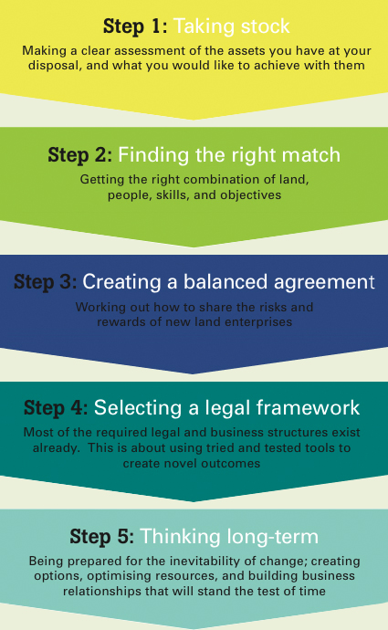 This way of thinking was developed further when in 2011 a group of like minded industry people and organisations came together and helped to create the Land Partnership Handbook: A new approach – using land to unlock business innovation. We wanted to show a ‘stepped’ approach to encourage the generation of new businesses through a variety of methods whilst making use of existing types of legal processes and contract types already recognised in this sector. A summary of who may be able to benefit from this approach and the ‘5 Steps’ follow but for a comprehensive understanding follow the links on this page to the handbook, our related training courses and workshops and Land Partnership case studies.